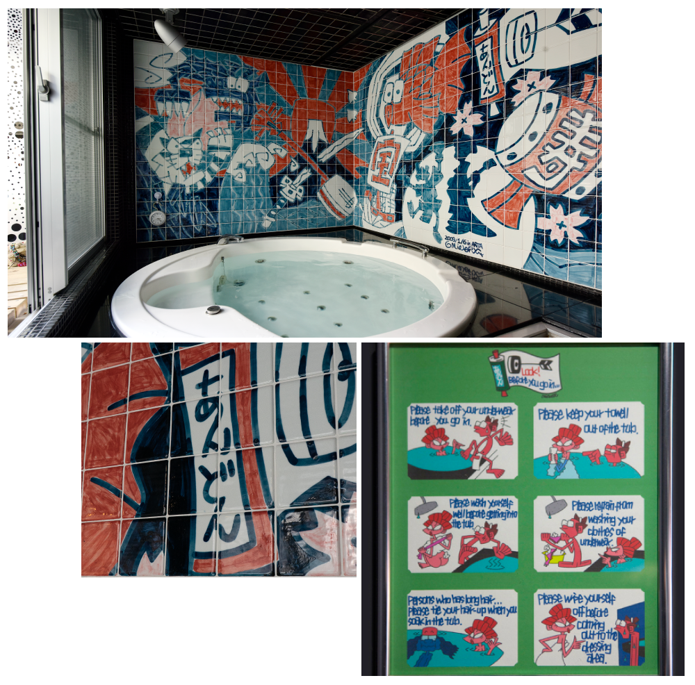 私が子どもの頃は毎晩賑やかな銭湯に通い、色々な出来事や光景を見てたくさんの知識や常識を得ました。また、お正月になると壁の大きなペンキ絵が変わるのをとても楽しみにしておりました、行燈のジャグジーでもその楽しさが伝わり、皆様がリラックスしていただけると幸いです。