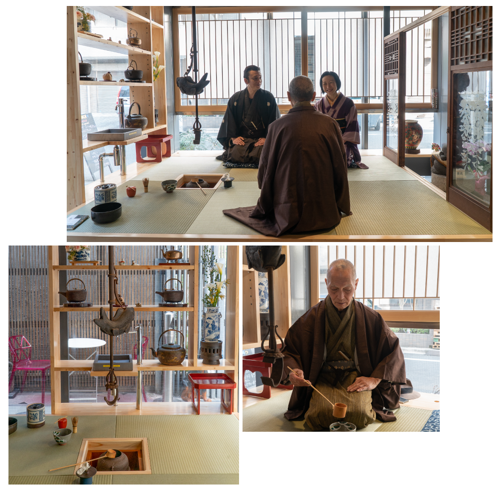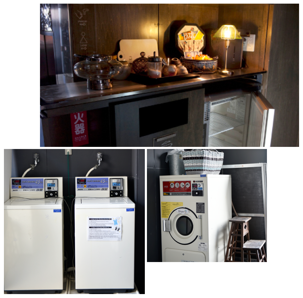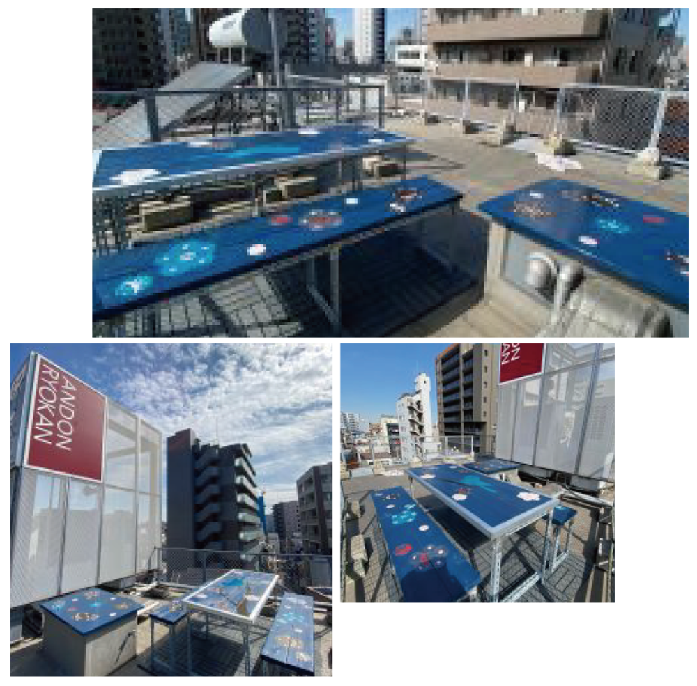 こちらの壁面タイルアートはアーティストであるミー石井画伯により、九州は有田焼の副島個人工房にて2009年に石井画伯が2晩かけ手書きで書き上げた作品です。副島工房ではタイルを窯で焼き、その後東京へタイルをバラで送っていただき、ミー石井、建築関係者と私とで行燈内で再びタイルを繋ぎ合わせ、タイル裏に番号を付けた後、タイル職人の方に完成させていただきました。完成後の真夜中、踊りを踊っている男の人の絵の左足が一枚さかさまになっているのを私が発見し、自分で正しい位置に戻したのも今では楽しい思い出になりました。