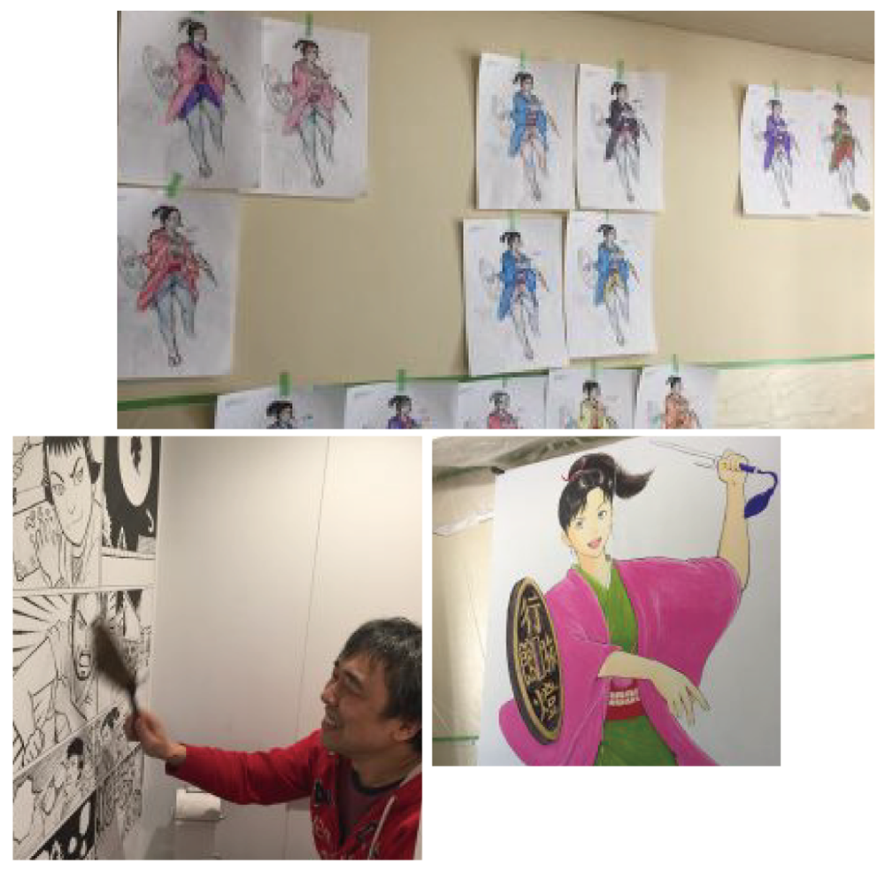 こちらの壁面タイルアートはアーティストであるミー石井画伯により、九州は有田焼の副島個人工房にて2009年に石井画伯が2晩かけ手書きで書き上げた作品です。副島工房ではタイルを窯で焼き、その後東京へタイルをバラで送っていただき、ミー石井、建築関係者と私とで行燈内で再びタイルを繋ぎ合わせ、タイル裏に番号を付けた後、タイル職人の方に完成させていただきました。完成後の真夜中、踊りを踊っている男の人の絵の左足が一枚さかさまになっているのを私が発見し、自分で正しい位置に戻したのも今では楽しい思い出になりました。